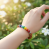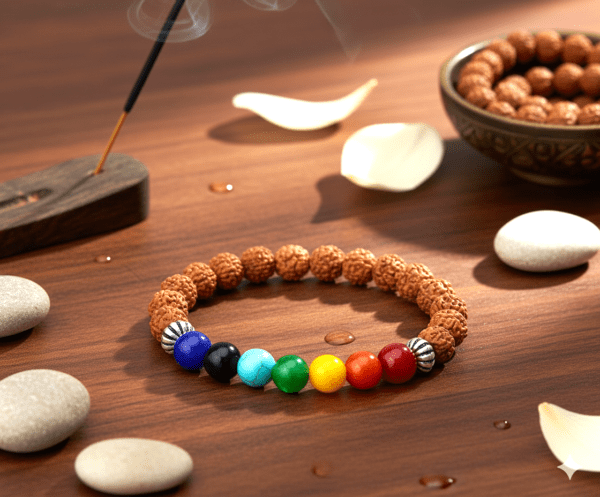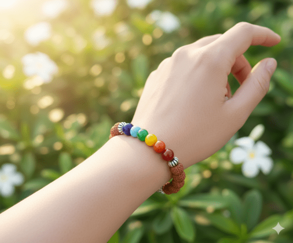 This bracelet combines Rudraksha beads with seven chakra stones, offering spiritual and physical harmony. The Rudraksha beads bring peace, reduce stress, and enhance concentration, while the seven colored stones balance the body’s chakras, promoting emotional stability and inner healing. Wearing this bracelet helps increase positive energy, improve mental clarity, and attract prosperity. It supports meditation, enhances spiritual growth, and protects from negative energies. Regular use can boost confidence, calm the mind, and maintain overall well-being. This sacred combination connects you with divine vibrations, fostering balance between mind, body, and soul for a more harmonious and positive life.