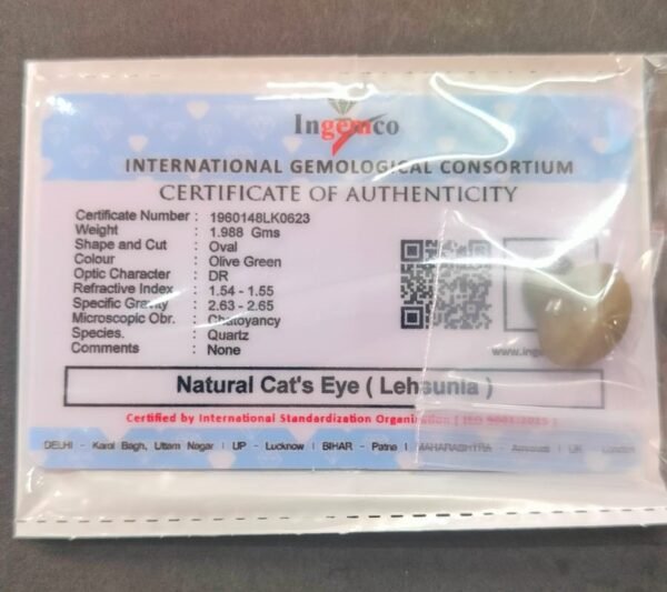 Certified Lahsuniya Cat’s Eye Stone With Certificate(सर्टिफाइड लहसुनिया स्टोन) | Weight- 16.30 Ratti