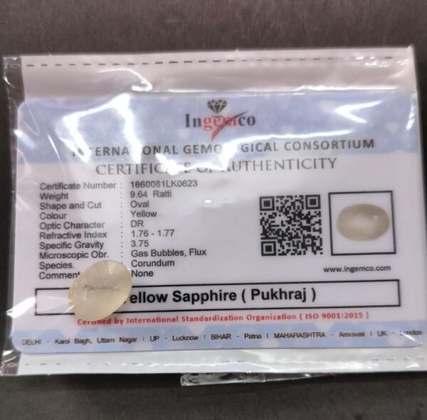 Be the first to review “Certified Pukhraj Yellow Sapphire Stone With Certificate(सर्टिफाइड पुखराज स्टोन) | Weight- 9.64 Ratti” Cancel reply
