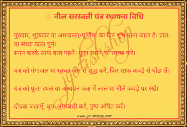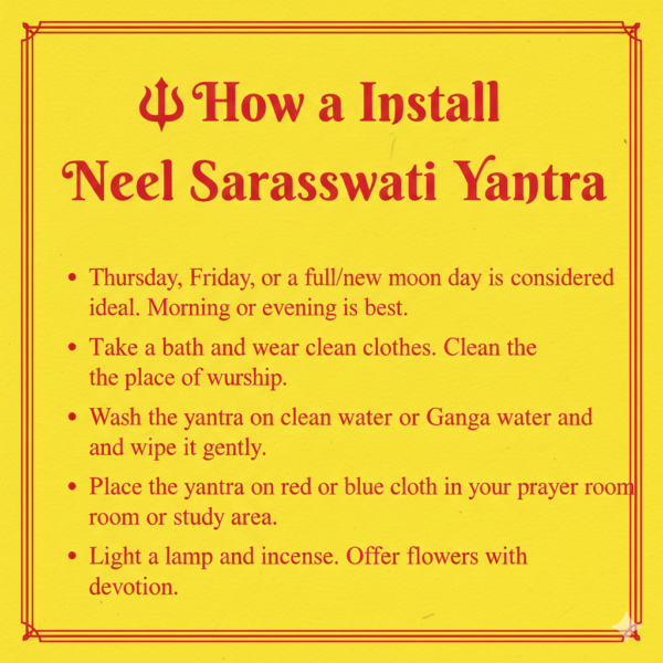 Neel Saraswati Yantra is believed to enhance knowledge, wisdom, and the power of speech. It is considered helpful for students, teachers, writers, speakers, and people involved in creative or intellectual work. The yantra is said to improve concentration, mental clarity, and confidence. It is also believed to reduce fear, negativity, and mental disturbances. In spiritual practice, it is associated with protection from negative energies and obstacles. Regular worship of the yantra is thought to bring inner stability, attraction, and personal influence. It should be kept and worshipped with respect and proper discipline.